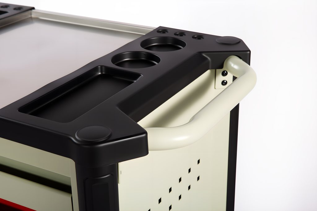 The top of the tool cart is injection molded on both sides with a pre-installed divider frame for easy workpiece storage.