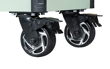 5. 5″ x 2″ polyethylene casters (2 stationary and 2 swivel with toe brakes)