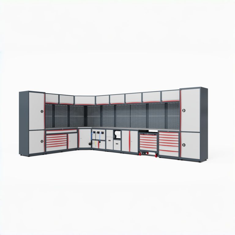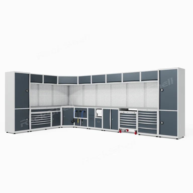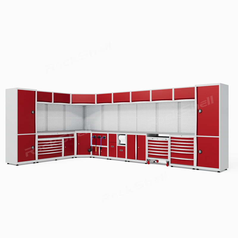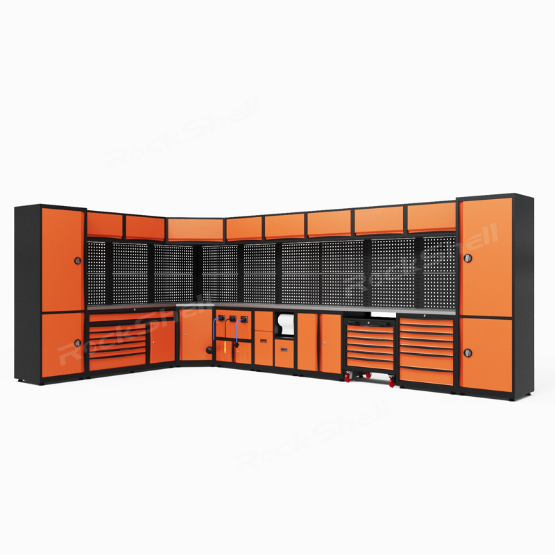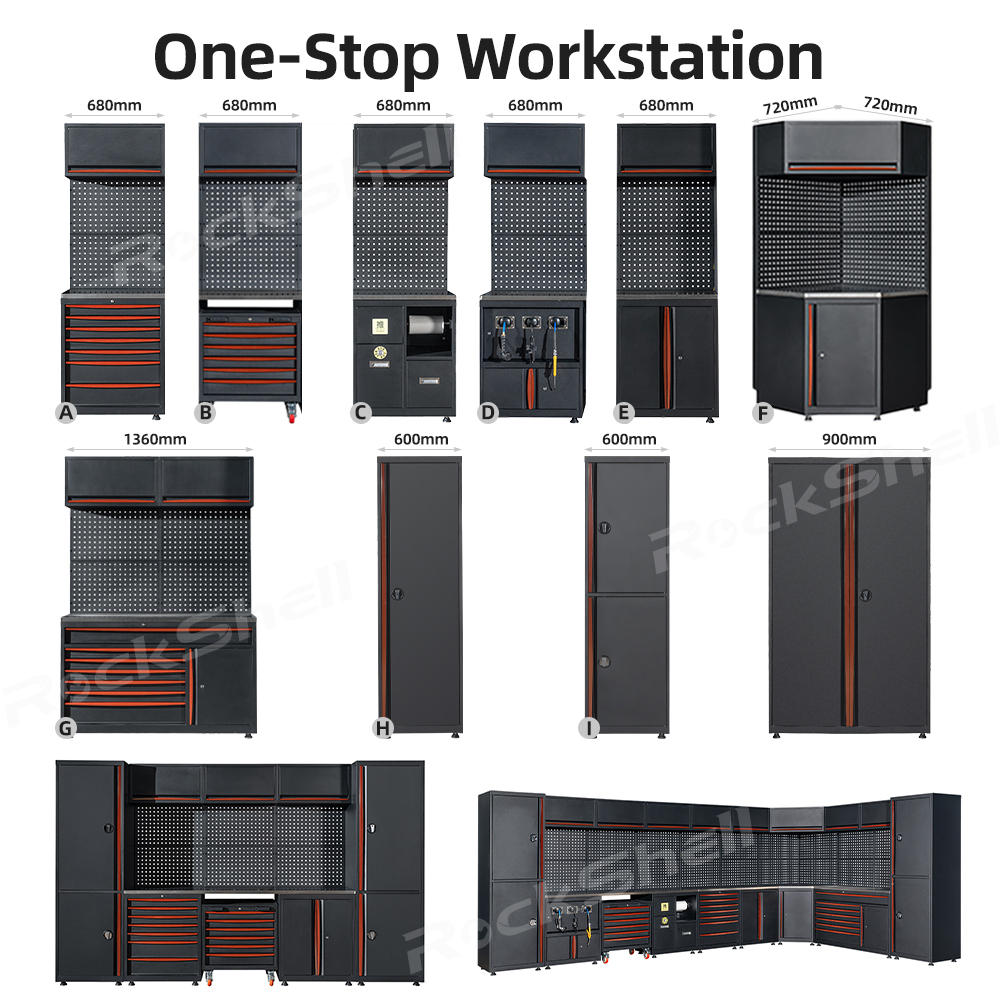 3. Positioned above are eight top cabinets, providing extra storage for infrequently used or seasonal items. Sixteen durable hanging back panels ensure frequently used tools are always within reach, helping maintain a clean and organized workspace.